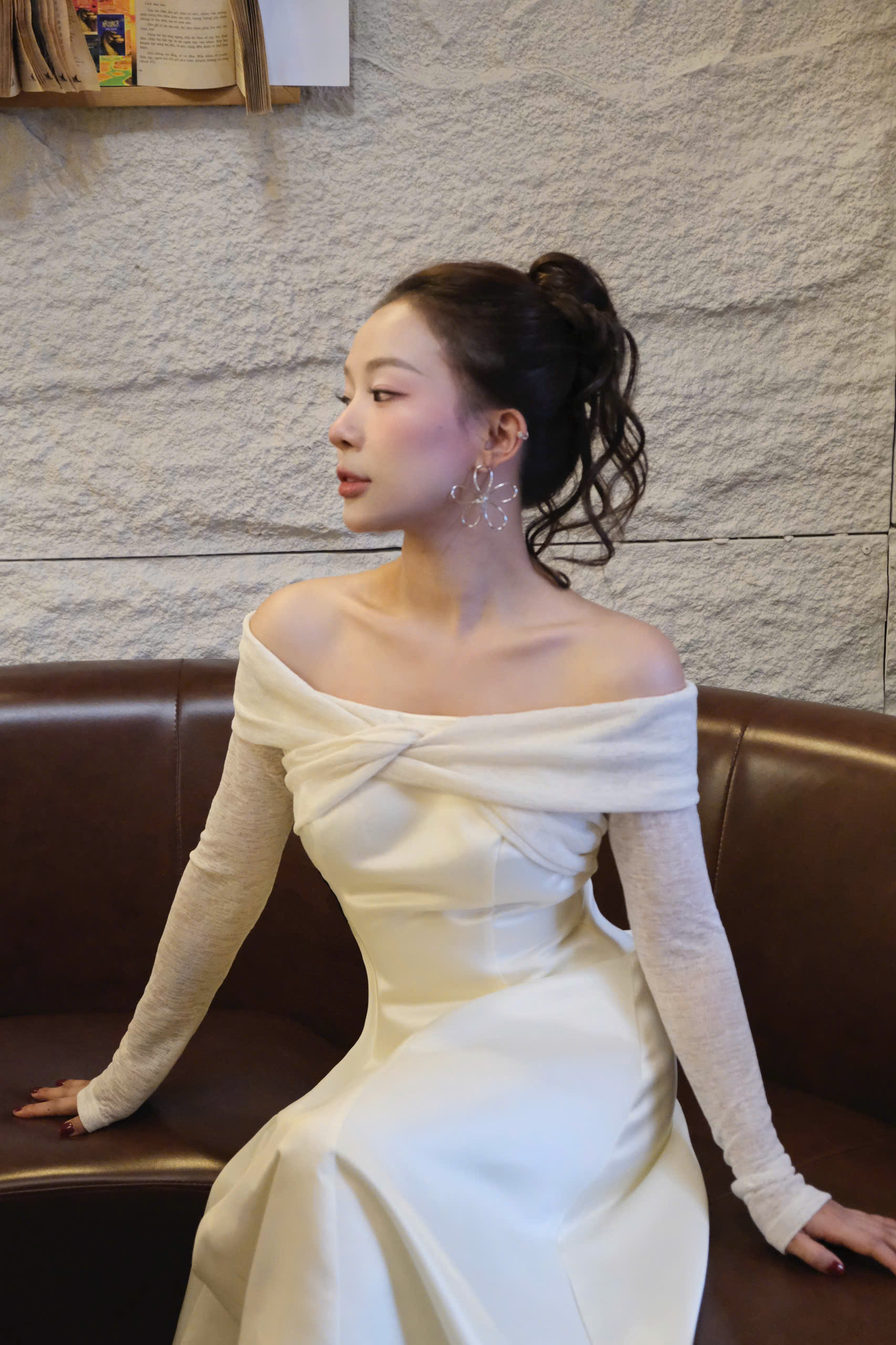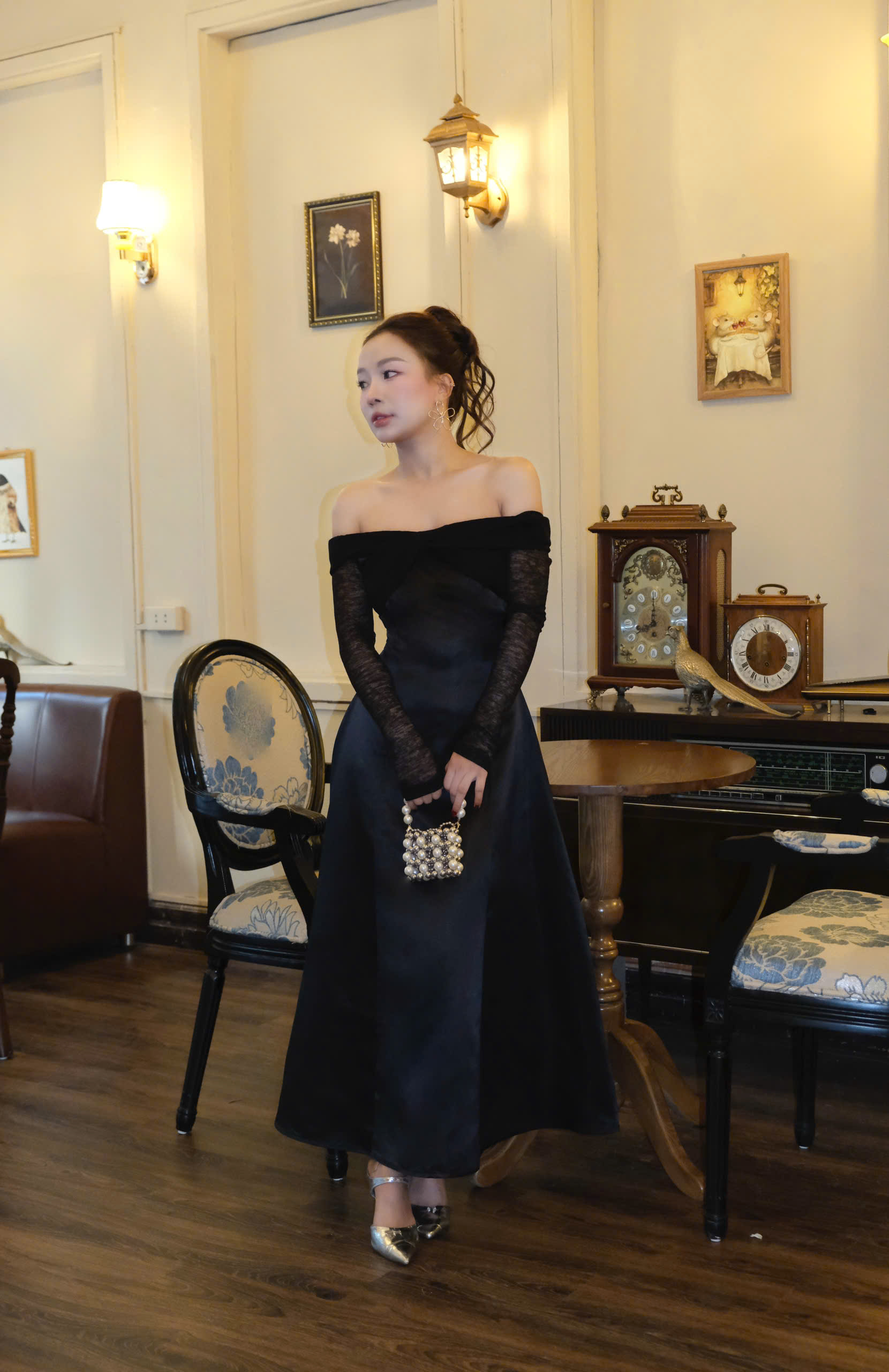 Thiết kế trễ vai mềm mại kết hợp chất liệu tafra sang trọng giúp nàng toả sáng ở mọi góc nhìn. Phần thân trên được phối thun co giãn, tạo độ ôm nhẹ để tôn vòng 1 và vai, đồng thời vẫn thoải mái khi cử động.
