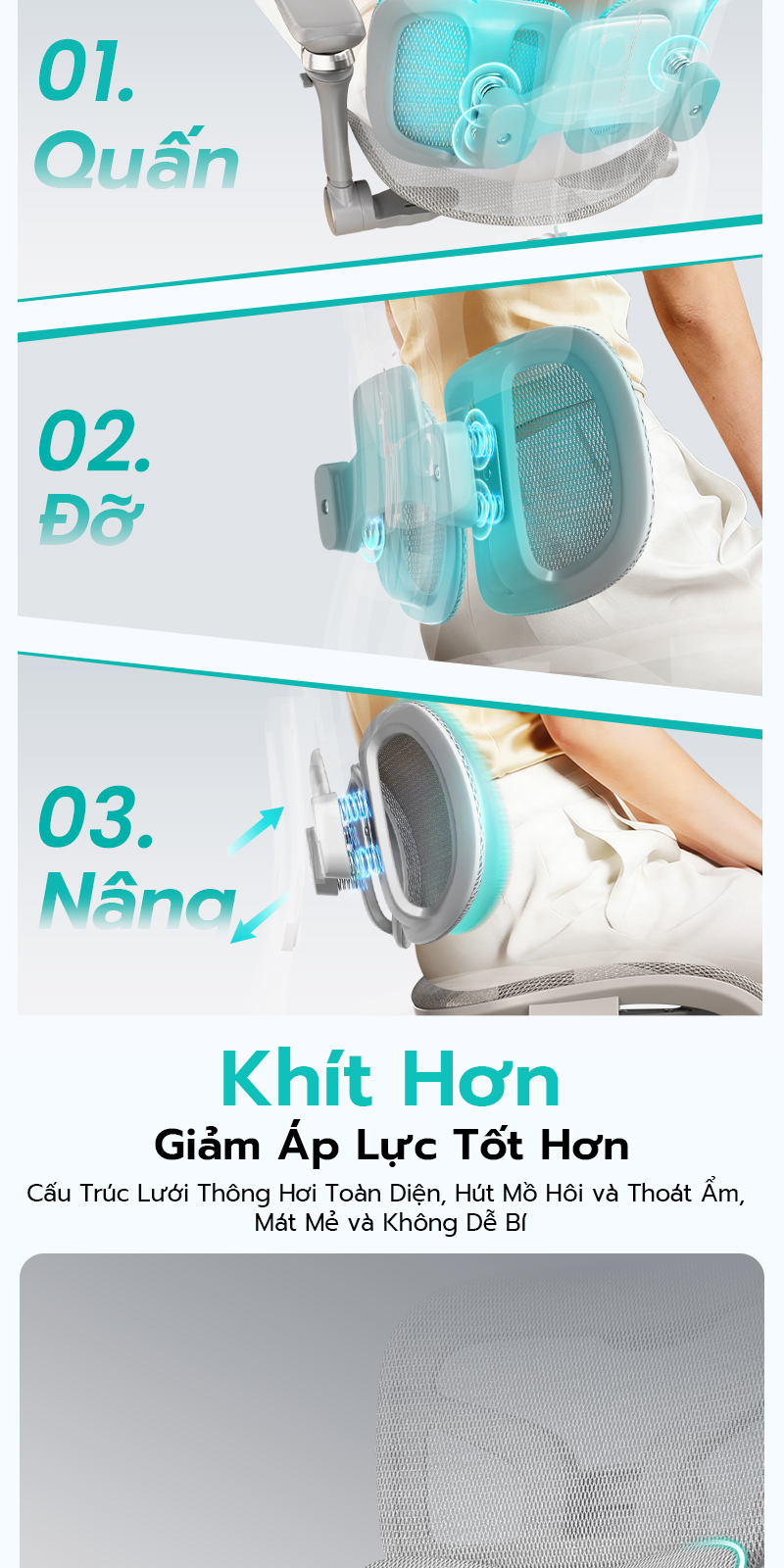 📌 Hệ thống tựa lưng có cảm biến lực, tự động thay đổi độ nghiêng theo tư thế của bạn.