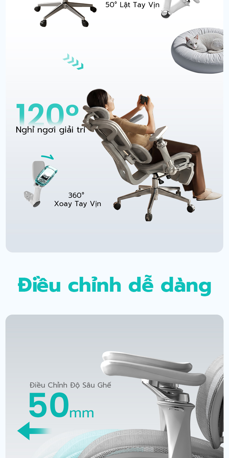 📌 Tay vịn xoay được 4 hướng: lên/xuống, trước/sau, trái/phải, xoay góc nhỏ để phù hợp cổ tay.