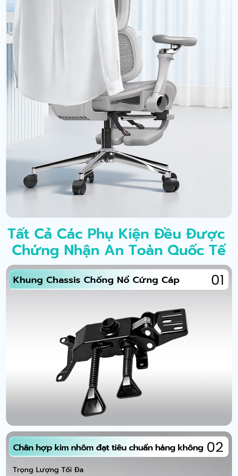 📌 Khung ghế, cơ chế lưng, bộ phận điều chỉnh và hệ thống lò xo – tất cả được bảo hành trong 5 năm.